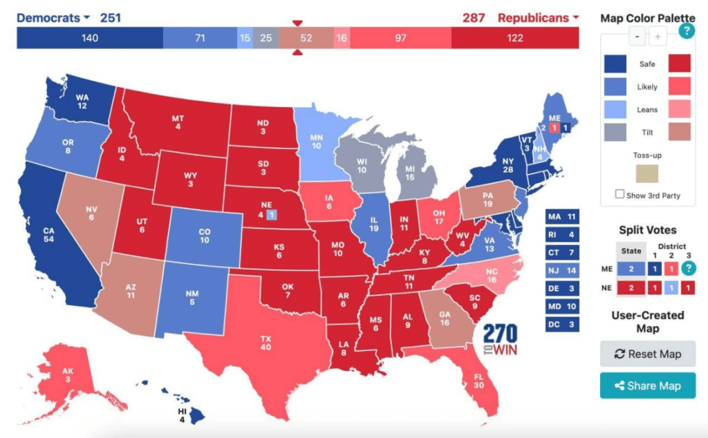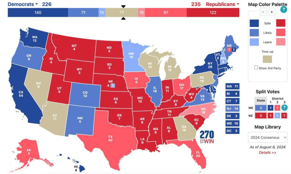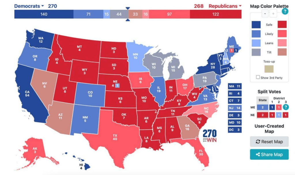 Harris and the Democrats would have to take all four swing states, Minnesota, Wisconsin, Michigan and Pennsylvania, as well as Nebraska’s 2nd District, to scrape together 270 votes if they wanted to win. It’s easier to reach that goal than it is to try to launch an offense in the Sun Belt State. And with the Democratic base still solid in those states, Walz as VP would be able to further catalyze the vote. But at the same time, Trump and the Republicans have a much lower degree of difficulty, and can take the election by simply staying on the defensive in the southern Sunbelt states and taking any of the three Rust Belt states. But assuming it turns out to be a hard to win area for both parties, the election would then end up 270:268 Democrats to Republicans.