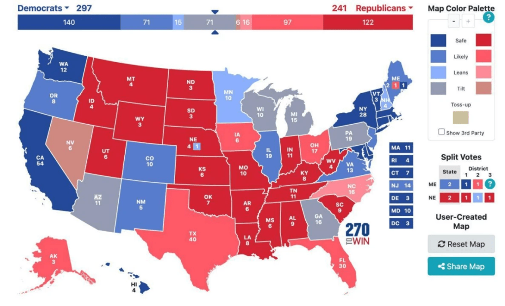 And if we believe that the pollsters have made changes after the 2016 and 2020 presidential elections because the 2022 midterms overestimated the Republicans and that the polls should be more accurate this time around, and overlay that with Trump’s criticism of Gov. Georgia, the Democrats would beat Trump 297 to 241. This scenario would have Harris replicating the 2020 election, with three fewer electoral votes due to population loss in the Democrats’ district.